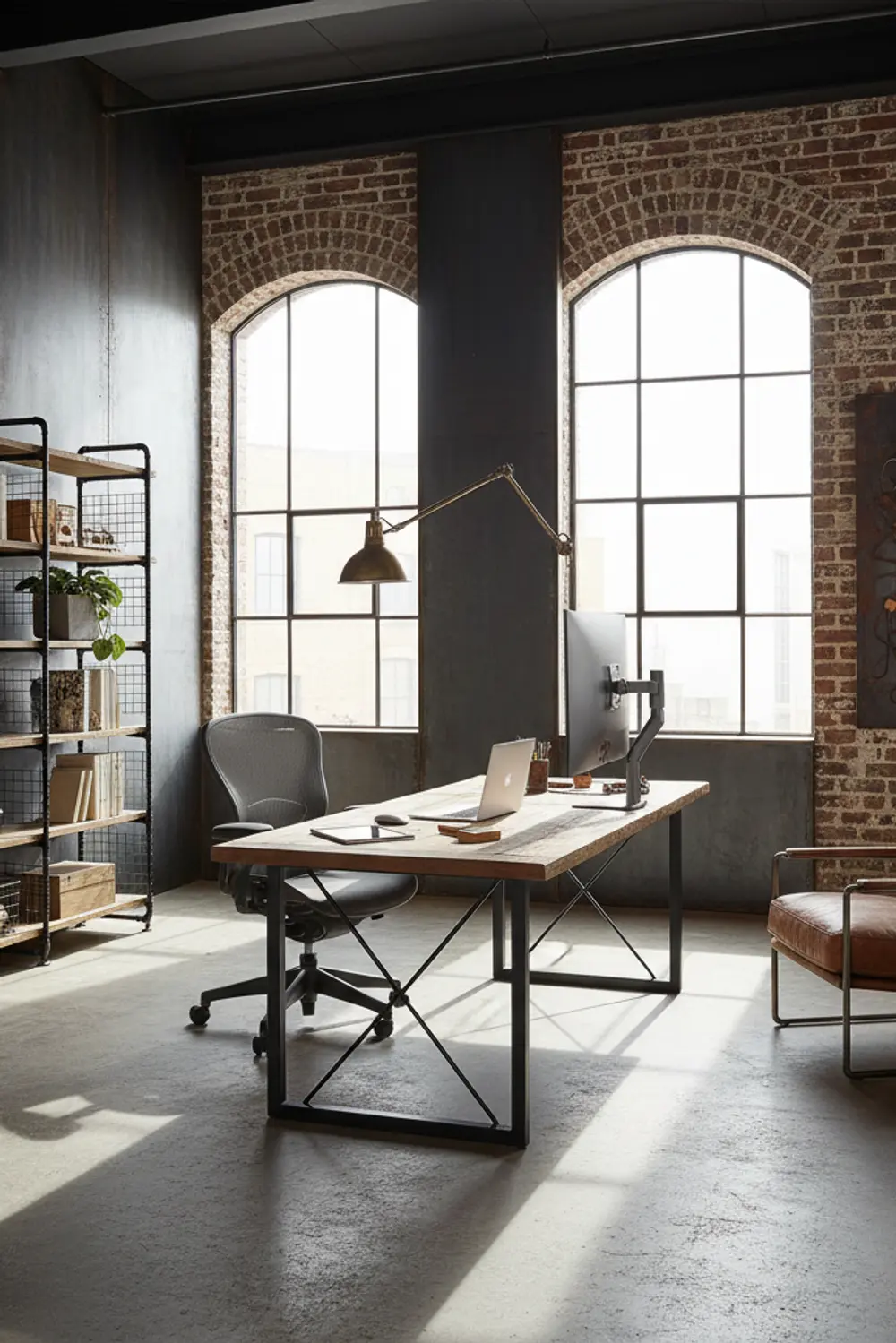 Now, let's look at furniture. Industrial style uses simple, strong pieces. You will want a sturdy desk. A metal desk is a great choice. You can find these in many stores. Pair the desk with an ergonomic chair. An ergonomic chair is a chair that supports your back. This will help you stay comfortable while working. Your health comes first!