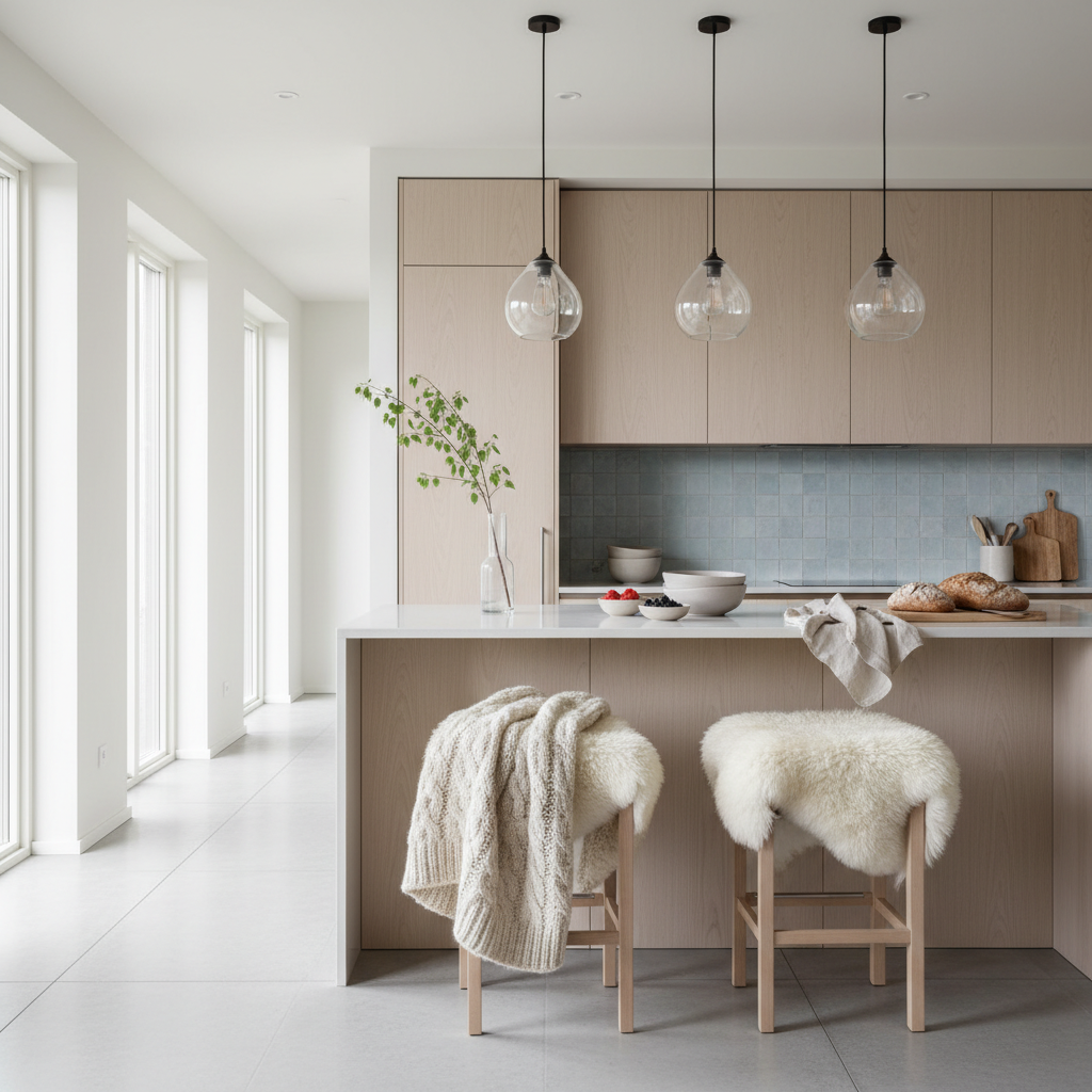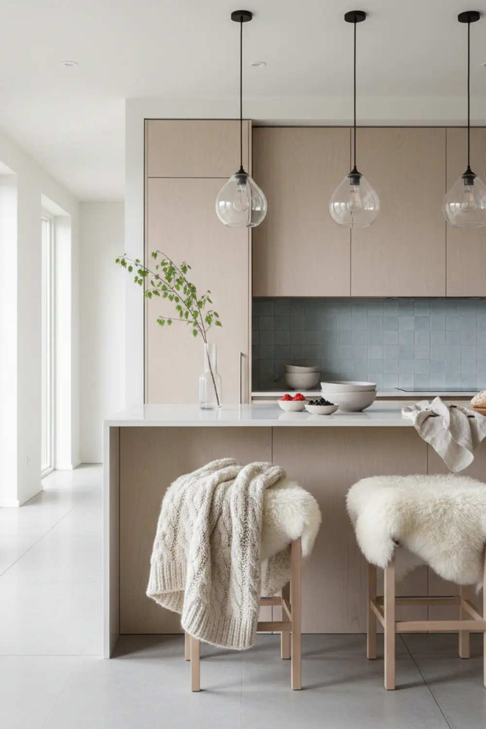 Texture is very important in a Scandinavian kitchen. It keeps the space from feeling too plain. Add knitted wool throws to your chairs or bench. Use a sheepskin rug for a touch of luxury and comfort. Think about your backsplash (the wall behind your counter). A backsplash made of smooth ceramic tiles can add texture. It is also practical for cleaning. Mixing textures will make your kitchen feel inviting and warm. This creates a balanced and interesting space.